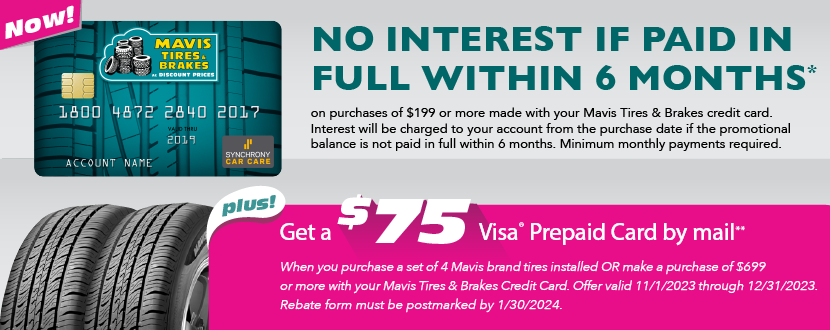 Our most popular Mavis Tires & Brakes financing option is our credit card. With the Mavis Tires & Brakes credit card you can take time to pay with 6 months promotional financing on purchases of $199 or more. This way, you can buy a set of new tires, and get vital repairs done for your vehicle, and take advantage of the benefits below.